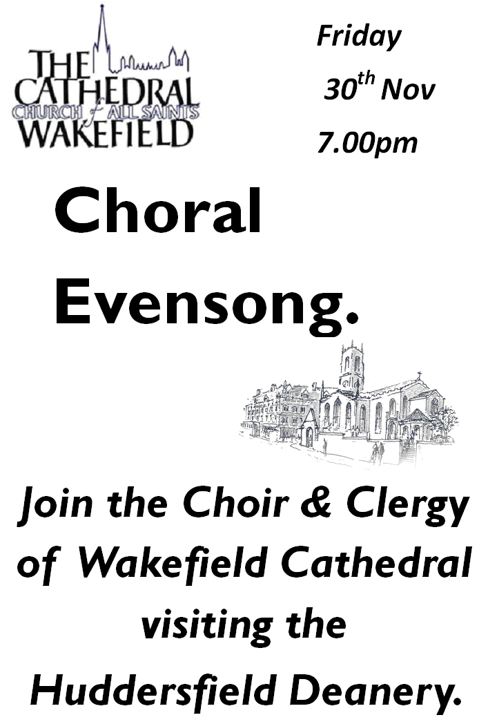 Friday 30th November, beginning at 7pm, worship through ‘Choral Evensong’ will be held in Huddersfield Parish Church. Congregations from the Deanery of Huddersfield and anyone who marvels at this form of worship are invited to this event.