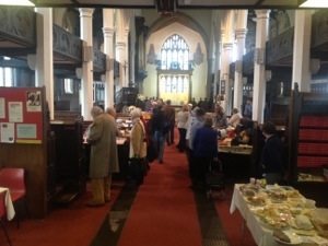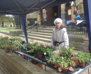 A blustery and showery day with short sunny periods but the plant Stall still went outside. A gazebo gave a little shelter but it was quite cold. Inside was a little better. With coffee and tea alongside hotdogs and soup to warm people as they came inside St Peter’s. There was a brisk trade on all of the stalls as a steady stream of people came into the church.