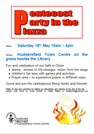 News Event – Pentecost Party Posted by huddersfieldparishchurch on May 16, 2013May 16, 2013 A a member of Churches Together in Huddersfield Town Centre St. Peter’s is a part of the festival this Saturday. Huddersfield Town Centre on the grass beside the Library. Come along and join the party!! Share this: Click to share on X (Opens in new window) X Click to share on Facebook (Opens in new window) Facebook Click to share on Pinterest (Opens in new window) Pinterest Click to share on LinkedIn (Opens in new window) LinkedIn Click to share on Tumblr (Opens in new window) Tumblr Click to share on Reddit (Opens in new window) Reddit Click to email a link to a friend (Opens in new window) Email Click to print (Opens in new window) Print Like Loading... Related