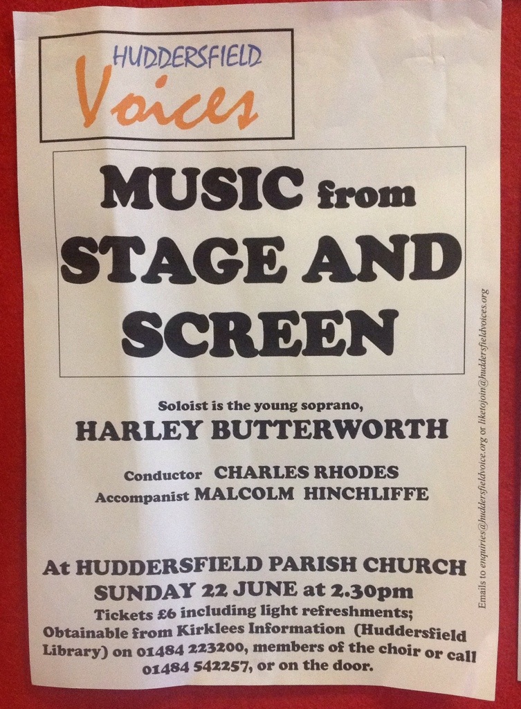 Sunday at 2.30pm the Huddersfield Voices deliver “Music from Stage and Screen”.