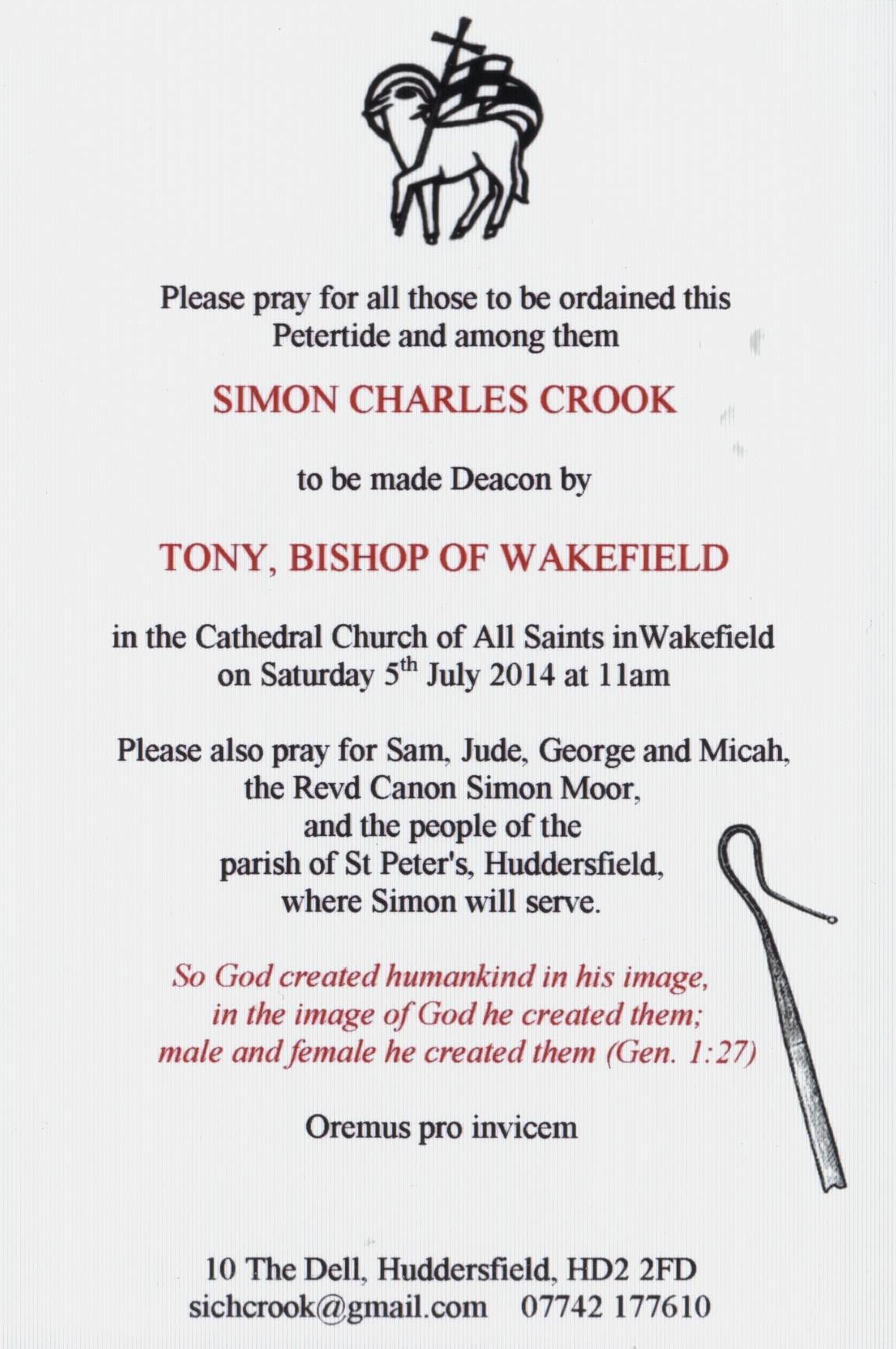 Saturday 5th July Simon Crook the latest curate at Huddersfield Parish Church is to be ordained at Wakefield Cathedral. Please hold Simon and his family in your prayers as they begin their time at St. Peter’s.