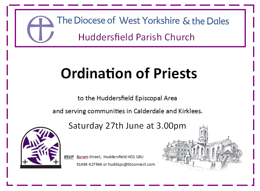 The Bishop of Huddersfield, Dr. Jonathan Gibbs will lay hands on six individuals for ministry of priest Saturday 27th June 2015.