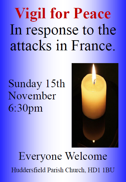In response to the events yesterday in Paris we are inviting you to come together to pray for peace and to light a candle if you so wish in St Peter’s – Huddersfield Parish Church, tomorrow, Sunday 15th November 2015 at 6.30pm. The Vigil will last about half an hour, and we invite you to bring a prayer or reading from you own faith tradition to share, so that we can, together, as people of faith show our solidarity with the victims and our desire for peace in love.