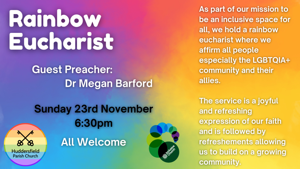News Rainbow Eucharist – Sunday 23rd November 2025 at 6:30pm Posted by huddersfieldparishchurch on November 18, 2024November 14, 2025 A eucharistic service for the LGBTQIA+ community and its allies. All welcome Share this: Click to share on X (Opens in new window) X Click to share on Facebook (Opens in new window) Facebook Click to share on Pinterest (Opens in new window) Pinterest Click to share on LinkedIn (Opens in new window) LinkedIn Click to share on Tumblr (Opens in new window) Tumblr Click to share on Reddit (Opens in new window) Reddit Click to email a link to a friend (Opens in new window) Email Click to print (Opens in new window) Print Like Loading... Related
