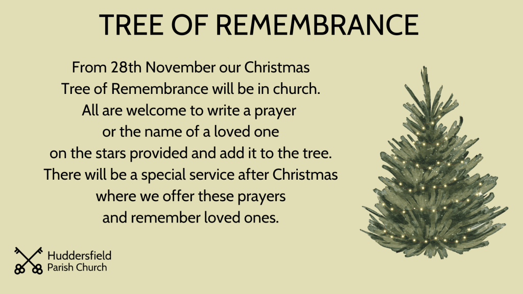From 28th November our Christmas Tree of Remembrance will be available in church. All are welcome to write a prayer or the name of a loved one on the stars provided and add it to the tree. There will be a special service after Christmas on Sunday 11th January at 4pm, where we offer these prayers and remember loved ones.